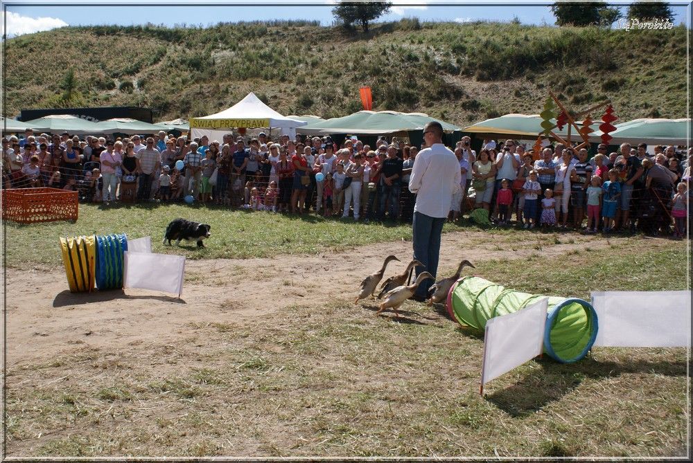 Atrakcją w niedzielę był pokaz pracy psa pasterskiego. Pies w typie border collie nie tylko trenowany dla przyjemności, co do codziennej pracy z owcami. Szkoda, że w pokazie nie brały udział owce a kaczki nieloty. Jednak warto było poczekać i popatrzeć. Sam pokaz trwał stosunkowo krótko, zwłaszcza w porównaniu z czasem rozkładania placu ćwiczeń.